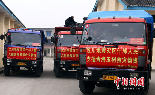 中新网什邡4月16日电(记者杨杰)16日上午,首批3辆满载着代表“5.12”地震极重灾区什邡人民深情厚谊的捐赠救灾物资车辆,从什邡市启程,开始奔赴青海玉树灾区。