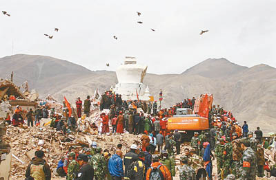 4月19日傍晚,一场预料中的雪降落在玉树的市镇和乡村,人们的心像破裂的房屋一样碎了。家园是没有了,在某些角落,废墟里偶尔会传出房屋下沉时发出的轻微的碎裂声。汽车被掉下来的房檐砸毁,没有倒下的房子里一片漆黑,家具裸露着,里面散乱着过去的生活碎片,比如结婚证、布做的花朵或者价格不菲的衣服。