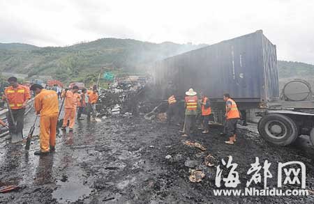 8时31分,一辆水罐泡沫消防车和一辆高速路政水罐车展开灭火工作。11时13分完全将火扑灭。昨天14点左右,车祸现场清理出一条应急车道,车辆开始缓慢通行。