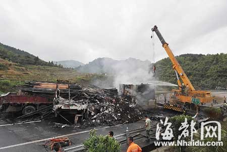 据尤溪消防大队有关人员介绍,昨天6时35分接到报警后,他们立即出动1辆水罐消防车。此时,高速交警和路政部门已经将路段实施全封闭。