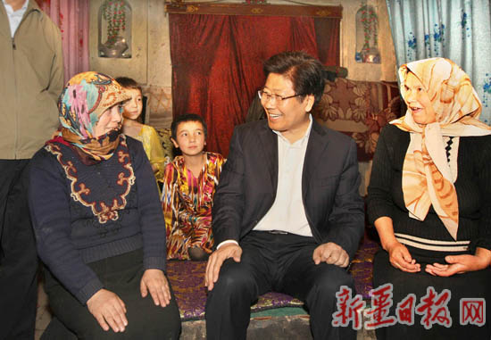 玉苏甫·艾买提热情地将张春贤让进自家的泥土房。45岁的玉苏甫·艾买提因患有胃病而家境贫困,全家4口人全年收入只有4000元左右,靠他外出打零工、种植2.5亩地为生,无力翻建新房。去年乡政府将这个村确定为新农村建设示范点,将在他家所在的片区统一规划建设抗震房示范点,建设资金由市、乡、农户三方共同筹集。玉苏甫·艾买提和家人看到了住进新房的希望。