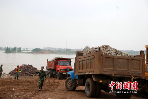 离决堤口不远,武警水电部队设立了临时指挥部,再往前有武警战士在指挥车辆卸倒石料,大块大块的矿石落入水中,砸起一朵朵浪花,旁边还停留了一艘水文部门的监测船。