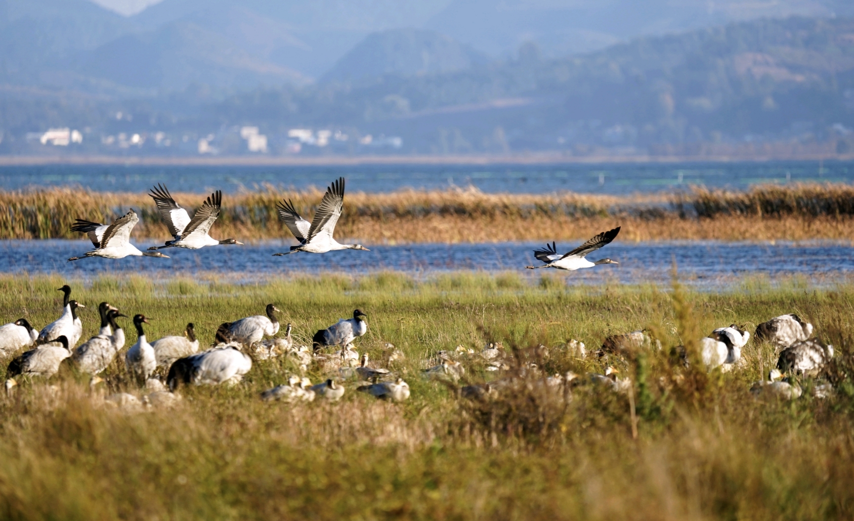 鹤鸣九皋,声闻于野。进入11月,贵州高原最大的淡水湖泊——草海陆续迎来“高原仙子”黑颈鹤到此越冬。