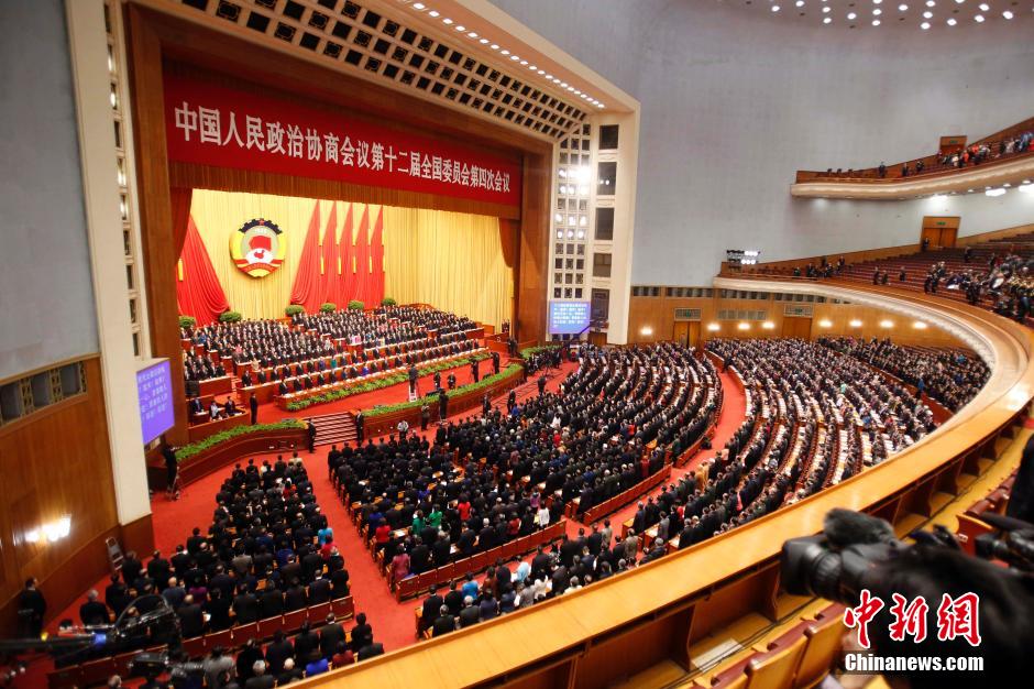 全国政协十二届四次会议闭幕 委员起立唱国歌