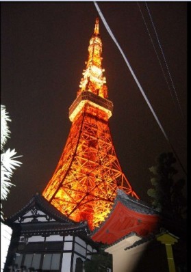 东京塔,正式名称日本电波塔,位於日本东京港区芝公园,是一座是以巴黎艾菲尔铁塔为范本而建造的红白色铁塔,但其高333公尺,比艾菲尔铁塔高出13公尺,是全世界最高的自立式铁塔。