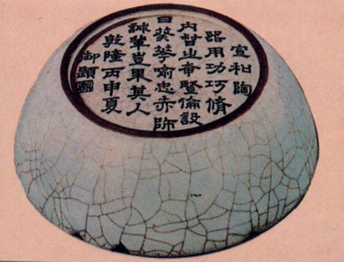 有些人以为南宋官窑加上乾隆皇帝御题,“价值益增”、“更为难得”,其实过于“迷信”古皇帝“名气”;却漠视保持古文物原貌之重要。其不伦不类之题字大煞风景外,更掩盖原支钉痕。