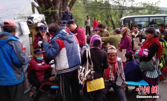4月29日,中国政府医疗队迎来17位地震伤员,该批伤员通过大巴车送到医疗队帐篷医院,接到伤员后医护人员迅速展开检伤分诊,并根据伤情轻重及时分流,伤员中最小的仅有2个月大。截止28日22时,中国政府医疗队已诊治地震伤员169人,其中重症18名,中度74名,轻伤77名。图为医疗队迎来一批地震伤员。中新社发 杨建英 摄