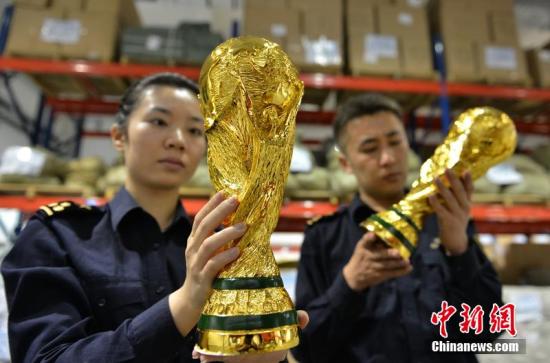 资料图:2014年4月,浙江义乌海关工作人员对查获的1020尊未获得国际足联授权的“大力神杯”进行深入查验清点。吕斌 摄 图片来源:东方IC 版权作品 请勿转载