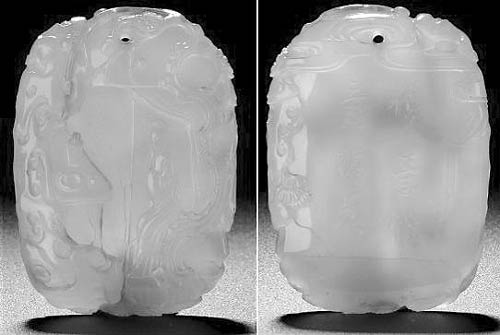 综观目前拍场上的玛瑙拍品,往往讲究的是俏色,就是通过雕琢把料质上的天然色泽运用得非常巧妙,这在玛瑙雕刻的术语中被称为“雅活”。与“雅活”相对的则是“素活”,其包括了“打钻掏膛”、“取链活环”、“肩耳制作”、“透雕活球”和“装饰雕刻”。在这件图珮中,就是将“装饰雕刻”的技术运用得淋漓尽致。图珮的正面是一位在文房清供前的仕女,周边则雕刻梅花,据说图案是来自明代晚期一本书中的插图,展现了明代仕女画追求淡泊恬静的审美意趣。背面则雕刻了六字草书,周边则以祥云图案装饰。