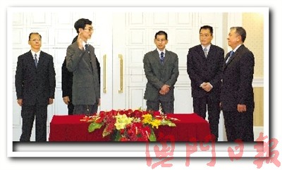 行政长官选举管理委员会就职仪式3日下午4时在特区政府总部黄厅举行。选管会主席、终审法院法官朱健,及四位委员:检察院助理检察长马翊、初级法院合议庭主席冯文庄、行政暨公职局长朱伟干、新闻局长陈致平,逐一向行政长官何厚铧宣誓并在就职状上签署,行政长官办公室主任何永安见证仪式。