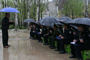 他的学生——来自陕西省公安系统的23名正处级与副厅级政委与协调员,穿着制服在小凳子上坐成四排听课。有人一手撑伞一手做笔记,表情严肃,陷入沉思。