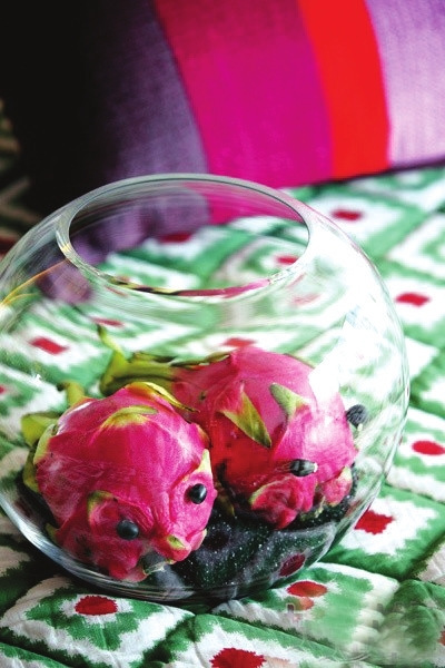 很多水果稍加改变或者修饰,就能让人耳目一新。这两只饱满的火龙果用黑豆“点睛”后就很像遨游鱼缸里的金鱼了,再配上晶莹剔透的玻璃鱼缸,情境就更加可爱、丰满了。其实有很多蔬果都可以改头换面,但前提是你需要有丰富的想象力才行。(张冠男)