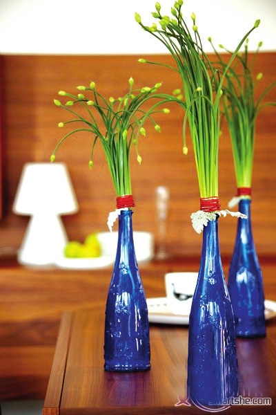 从未想过蒜苔也可以这样优柔吧?以银叶菊叶片为辅助花材,将蒜苔用红水木枝捆扎成型,插入花瓶。如果只是一只花瓶,看起来会很孤单,3只放在一起就很有气氛。蒜苔在制作之前最好整体先用水浸泡吸足水分,否则插入后会很容易疲软而失去挺拔之势。捆扎花材的素材也可以选择更多柔软的天然枝条。