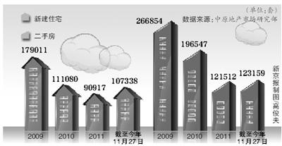 截至11月27日,北京二手房住宅签约套数为123159套,已经超过2011年全年121512套的二手房成交量。而今年新房住宅签约107338套,已经超过2011年全年90917套的成交量近万套。11月是传统的成交淡季,市场却出现了回暖。 记者 刘狄