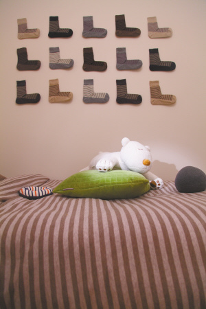 75方的两室格局,蒋俏做了一个主卧一个儿童房的设计。在儿童房,最抢眼的装饰莫过于那面“袜子墙”。“最初的灵感来源于无印良品的直角袜,任何一种同尺寸彩袜都能玩这项创意。”把袜子三五成排,错落颜色,等距离排列后,直接用钉子固定在墙上,一面超有个性创意的袜子墙就诞生了。“袜子的材质非常绵软舒适,即使顽皮的宝宝抓玩,家长也不用担心会碰伤。”