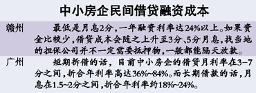 周先生表示,当地的中小房企融资主要走的是民间借贷的渠道,或者找有资金的人以入股的形式筹集资金。而据周先生和上述广州民间融资人士介绍,中小房企通过民间渠道来融资的成本相当高。