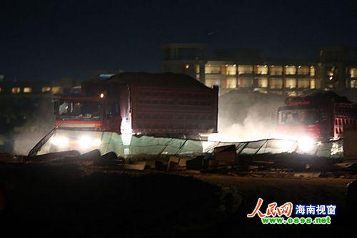 15日凌晨2点,记者再次来到海棠湾开发区海棠北路,根据沿路观察,与其他酒店工地偶尔只有几辆混凝土车、板车、卡车进出不同的是,三亚香格里拉大酒店工地门前仍然是车水马龙,并且清一色都是十轮卡。记者从三亚香格里拉大酒店工地一侧观望,虽是深夜,工地内仍然是一片热火朝天的作业景象,驶进的空车不时与驶出的满载海砂的车辆,将工地内的道路堵住,后面的车辆也依次排起长龙。