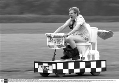 不少人都曾有急于寻找厕所却被车辆堵在马路上的遭遇。22日,英国33岁的水管工科林-弗茨花费一个月时间发明了世界上速度最快的移动马桶,行驶速度高达每小时55英里。这台移动马桶靠汽油提供动力,每行驶10英里耗油1加仑,它使用方便,轻轻按下把手,马桶即可进行冲水,而把手前有一个夹子,使用者可以将报纸夹在前面,边使用移动马桶边阅读报纸。图/东方IC
