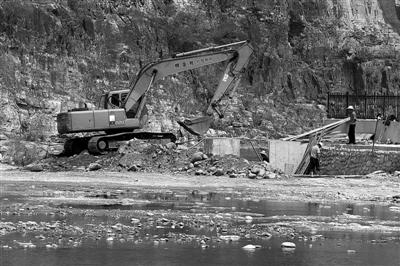 5月30日,十渡。工人们正在河道里修建拦水坝。新京报记者 尹亚飞 摄