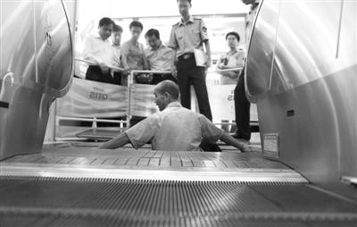 2011年7月6日,北京朝阳大悦城,工作人员在检查一层直达五层的“飞天梯”。新京报资料图片/薛珺 摄