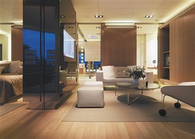 案例中设计师使用镜面家具、镜子和灯光,将空间打造成明暗交错的设计风格。卧室与会客厅之间为衣柜和显示屏,合金材质和镜面技术,避免了小空间带来的局促感。空间采取屋顶边角的柔和光源,避免灯光直接照射在镜面上。整体空间中,设计师放弃墙壁,尤其在盥洗空间与外部空间接壤处,使用大面积玻璃与镜面,营造出亦真亦幻的室外风景,室内视野开阔大气。