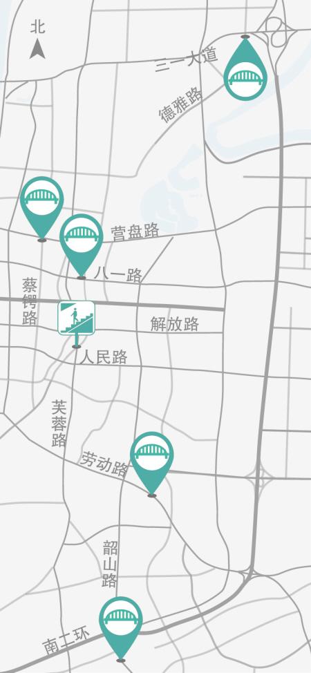 劳动中路天桥位于东塘步步高超市东面,考虑自行车上下楼梯,靠内侧将做推坡道。由于靠人行道外侧为非机动车道,考虑天桥美观,天桥桥面将做成拱形。三一大道人行天桥位于德雅路口,以前行人过街走斑马线,但人流量较大,经过研究决定,此地也采用人行天桥方案。考虑到附近有两所医院,所有人流均往十字路口穿梭,人流较集中,营盘西路的人行过街天桥将建在隧道口,目前该处天桥设计还在研究中。在八一桥的东侧不能上下桥,经研究决定拟建人行梯道。