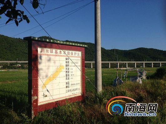 29日,南海网记者来到村民反映的中廖村,沿着水泥小路驶进,在农田区入口处,立了一块显眼的碑,上面明确标注了“田独镇基本永田保护区”(田独镇已更名为吉阳镇),面积85.82公顷。碑上还有清晰的地图、以及方位标识。