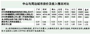 记者对比2012年中山及周边城市的房价后发现,中山在这些城市中不仅房价最低,房价与人均可支配收入以及城镇职工月工资的比值也是最低的,如果把房价收入比简单地计算为房价与月工资的比值来看,2012年中山的房价收入比为1.13,在珠三角8个城市中是最低的(详见表格),而同期深圳、广州、珠海按上述方法计算的房价收入比分别是3.81、2.69和2.64。相当于如果在中山工作10年的收入可以买房,在广州、深圳和珠海要20~30年。