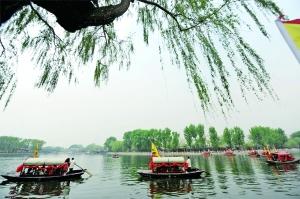 “开船喽!”随着船工一声号子响起,16条摇橹船雁翅形排开,驶离什刹海漕运码头……什刹海水上游再现旧时繁忙的漕运景象。(资料图)首席摄影记者 蔡代征/摄