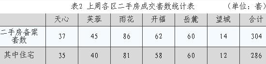 新房市场的涨势并未延续到二手房市场,上周长沙二手房成交量仍在低位徘徊。来自长沙市房产研究中心的数据显示,上周长沙市内六区二手房成交304套,3.97万平方米,其中住宅成交286套,3.85万平方米。