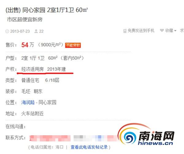 据显示,网上公开出售的房源大多来自“同心家园”一期、三期、五期、六期,均是通过中介公司出售,价格比同地段的商品房低很多。信息栏上大部分描述所售房源可以销售,或说明5年后才可以办证过户等。但个别信息栏上关于房源描述的产权项上标明为“经济适用房”。