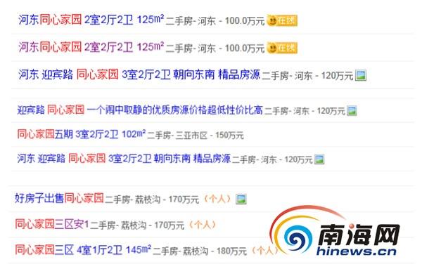 29日,南海网记者登录该家分类信息网站,同样键入“同心家园”字样进行搜索,确实发现了诸多三亚市“同心家园”项目房源的售房信息。记者粗略统计发现,出售房子的信息有近15条。当天发布的信息就有3条,其中二手房出售一条、新房出租两条。随后,记者再次登录另一家房产网站,搜索“同心家园”后,出现6条出售房屋信息。