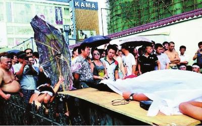 8月3日下午3点多,在湖北武汉中山大道佳丽广场,十多名赤膊男子披麻戴孝,用门板抬着一具“尸体”示威,宣称城管打死人了。而记者了解后得知,这其实是因为小贩不满城管执法方式,策划的一出闹剧。“死者”在佳丽广场侧面躺了数小时后,因耐不住天气炎热“复活”逃跑。目前,警方已经控制4名闹事者,诈死男子在逃。