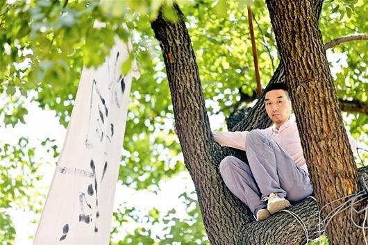 昨日上午11时许,记者赶到现场时,陈某坐在离地10余米高的树杈上。树杈上挂着一条白床单做的黑字大条幅。陈某显然做了准备:树杈之间,搁着三根木条,可供安全歇息,他甚至还将一桶水提上树,放在身边。不过,陈某所处的位置离地足有4层楼高。树下,陈某的妻子急得团团转,不停央求他下来,消防官兵、辖区民警和社区干部守在树下,也在劝他下树,陈某不为所动。当消防官兵抬来气垫,准备铺在树下时,树上的陈某立即情绪激动,威胁要往下跳,消防官兵只得作罢。
