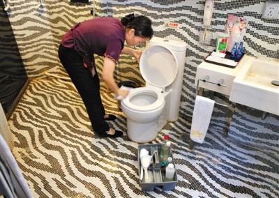 前日,百子湾路的美豪富邦酒店客房内,保洁员正用抹布擦马桶。美豪富邦酒店“浴巾擦马桶”遭曝光后,其酒店开始整改。