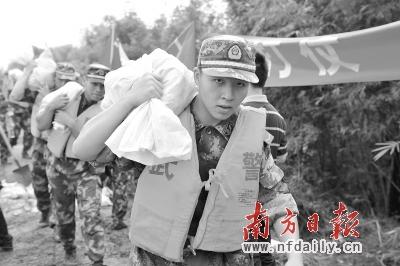 ←官兵们趁雨停的好天气抓紧修补河堤。南方日报记者 梁维春 摄