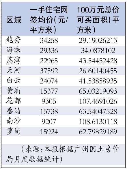 海珠、荔湾、越秀、天河、白云五个区一手住宅网签均价都已经突破2万元,天河和越秀区单价更到了“3”字头。7月本报记者曾根据上半年的数据计算,当时一名首次置业者,手中如果有30万元的首付款,以总价100万元的购房预算计算,在天河区只可以购买28.6平方米的蜗居,在越秀区可以刚好买到30.2平方米的房子,而在房价最低的花都区,还是可以买114.5平方米的大房子。
