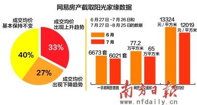 网易房产截取阳光家缘数据,抽调了100个楼盘的成交均价和7月进行对比,结果显示,有33%的楼盘成交均价出现上升趋势,和上月一样;有27%的楼盘成交均价出现了下降,比上月的33%减少了6%;40%的楼盘成交均价则基本保持不变。