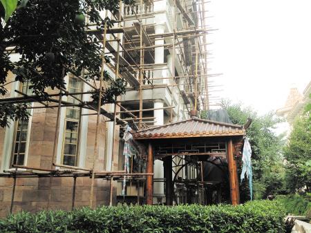 记者调查:记者前日下午来到人民东路浏阳河桥边的水云间小区,刚从北边的大门进去,就听得电锯声一阵紧似一阵。几分钟后,记者在该小区第三街发现,有两处别墅北边搭上了架子,几名工人正用电锯和电钻在施工。再往里走,类似的搭建不少。在十街到十七街之间,有些整栋房子都搭了脚手架,有的房子的南面和北面都在搭建,有的在侧面的花园用地搭占,施工的响声此起彼伏。