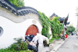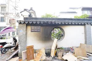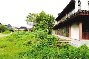 这些建筑的外面,都被一堵高高的院墙拦住。记者通过这些围墙的花窗,仔细地数了一下,在这条不到一公里的小街上,一共有8幢仿古建筑,基本上都是大门紧锁。而院落里的景象,则让记者大吃一惊:整个院内长满了半人高的蒿草,显然已经很久没有人打理过,小桥流水、亭台楼阁等景观,在荒草的围掩下,已经失去了生动的“表情”,看起来非常的萧条和荒凉。