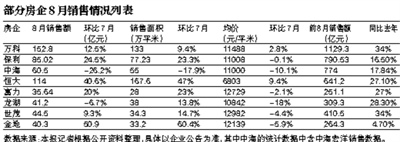 而9月将成为关键节点,由于万科、中海、恒大等龙头公司后四个月的货值普遍占全年的40%上下,业内预计9月份大多数龙头公司月度销售将较8月有明显增长。