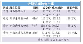 合富置业市场经理梁燕明表示,近10个月以来二手住宅市场上短线投资需求占比不超过3%,7月短线投资成交个案占比约1.9%。目前炒房所依赖的外部环境已不存在,加上限购限贷以及新“国五条”后悬而未决的“20%个税”,均对炒家入市心理造成一定影响。如惠福东路某套80多平方米的两房物业,投资者老张在3月时以低于市场价的120万元买入,持货3个多月后,近期以156万元成功出货,账面获利36万元。老张当时买入时正值广州细则出台前,由于担心可能会实行20%个税影响出货速度,亦做好长线持货,没想到按计划顺利出货后账面获利超过30万元,大大超出预期。