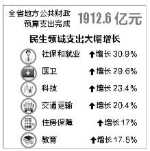 “政府花钱多,关键是要看办了些什么事,涉及民生的部分很多。”李妍分析,全省地方公共财政预算支出完成1912.6亿元,民生领域支出大幅增长,其中,社保和就业支出增幅最大,达到30.9%。