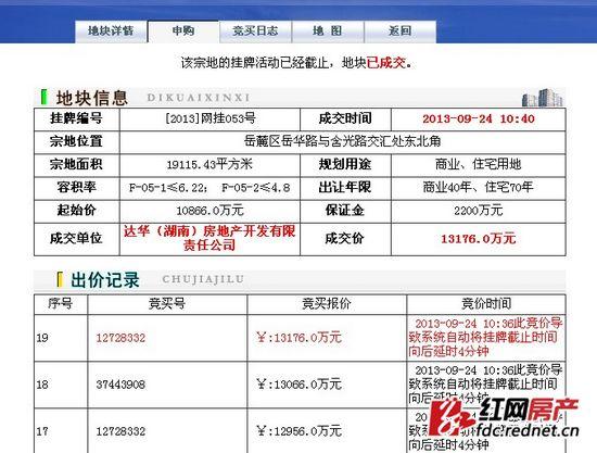 经过19次出价后,网挂053号地块被最先出价的达华(湖南)房地产开发有限责任公司收入囊中,成交价13176万元,溢价率21%。
