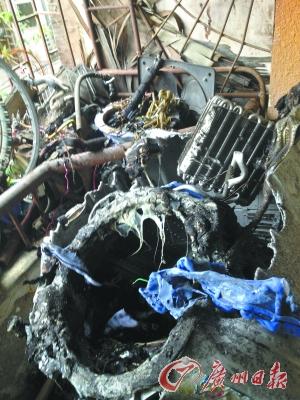 205房住户阳台上的洗衣机外壳被烧熔化。