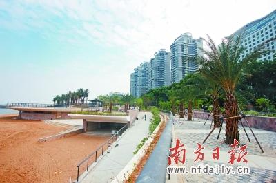 记者从大门进入施工现场,沙滩上几台挖掘机正在来回穿梭,海边的阶梯式坐台已基本完工,一块块崭新的瓷砖和大理石块铺就了三条长达120米的步行道和长椅。沿阶梯式坐台一路往上,一排大王椰迎风而立,一座葱翠的城市小花园随即映入眼帘。
