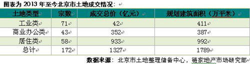 另据链家地产市场研究部统计,截至今年11月4日,北京已经出让土地172宗,成交总价为1327亿元。其中住宅类土地成交58宗,建筑面积992万平米,约为2012年同期2.15倍。