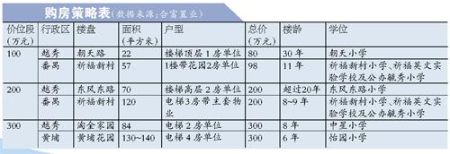 近策略:“持100万元的买家可考虑在旧城区朝天路附近找学位房。”合富置业高级营业经理郭洪英建议买家可以寻找30平方米左右的单间或1房单位,这些是楼龄大约30年的混合结构单位,且为顶楼物业,虽然物业稍旧一点,但带有名校朝天小学学位。由于100万元的总价不算高,所以这些小面积的学位房特别抢手,基本上一放盘就被快速消化掉。