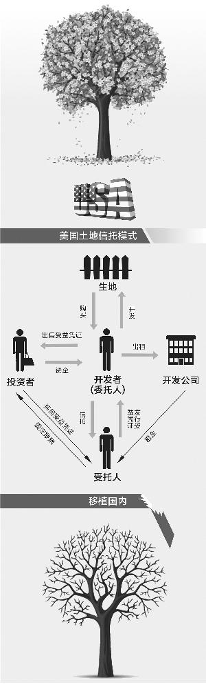 土地信托在美国开展得较早,目前已形成比较成熟的体系,该信托模式是开发者(委托人)购买一块生地,再将该土地所有权信托给受托人,签订信托契约。
