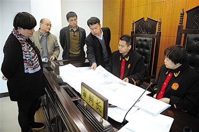 昨日庭审中,原告一方给法官展示被收回承包地的方位图。通讯员 李佳 摄
